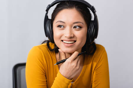 brunette asian woman in wireless headphones holding pen and touching chin while looking away