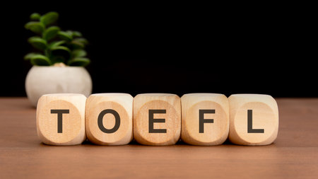 wooden blocks spelling TOEFL on wooden table with black background and plant, symbolizing English language learning, international exam preparation, and education.