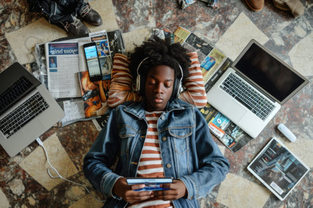 The top view of picture that about young african american human laying down and listening to the music and focused in the full of the thought and music with room that surrounded with devices. AIGX03.