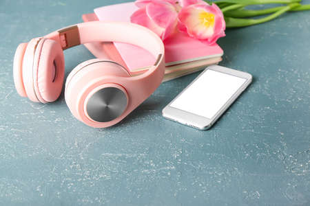 Modern headphones, mobile phone, tulips and notebooks on color background, closeup