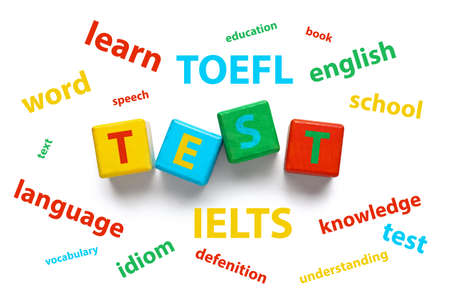 Wooden blocks with the word IELTS - international standardized test of English language.