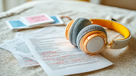 Learning foreign languages. Notepad for entries and a flag. Language courses, audio audition.