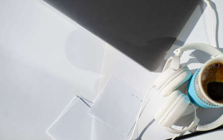 border. workplace. laptop. white headphones. Ceramic glass of fresh coffee and writing sheets. black pencil. Copy space for text.
