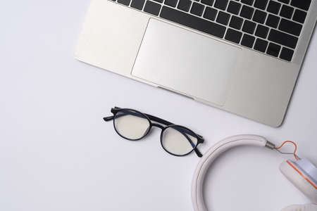 Mock up and top view with notebook computer, eyeglasses and headphone, Work space concept.