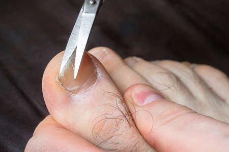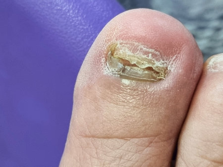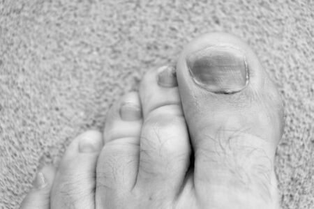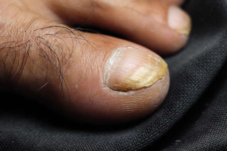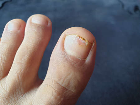 Toenail disease, big toe fungus, toenail erosion close up, health and medicine