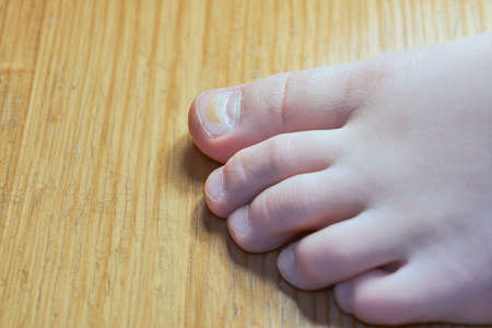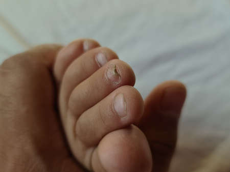 Closeup of a foot with damaged nails because of fungus. Dorsal, callus and corn feet infected by germs that cause nail dislocations.