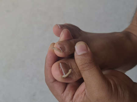 Effects of enterovirus on the body in the form of damage to the thumb. His fingernails became uneven and cracked. Left-side view. Human health and medicine.