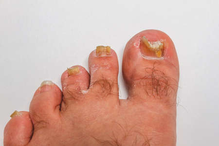 Fungal infection on the toenails of the foot, on a white background.