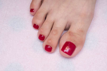 Close up view of beautiful female feet with delicate pedicure nails, red gel polish, on beauty salon background