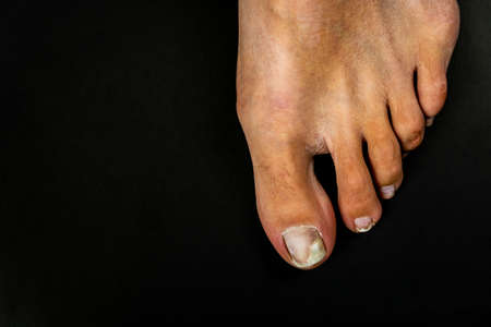 Toes of a female foot close-up with nails affected by a fungus on a black background. Foot health and hygiene. Free space for text.