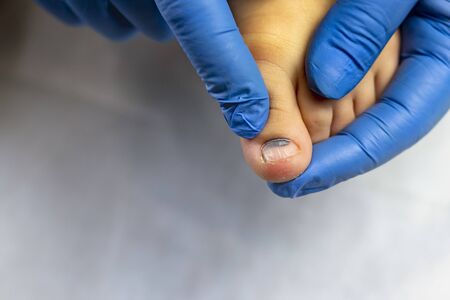 A close-up of a foot with a fungus on the nails is examined by a doctor in gloves. Onycholysis: detachment of the nail from the nail bed.