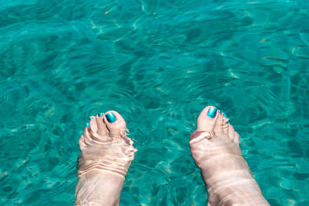 Female feet with glitter azure pedicure in turquoise transparent pool water. Concept background with copy space for spa, holiday or relax travel