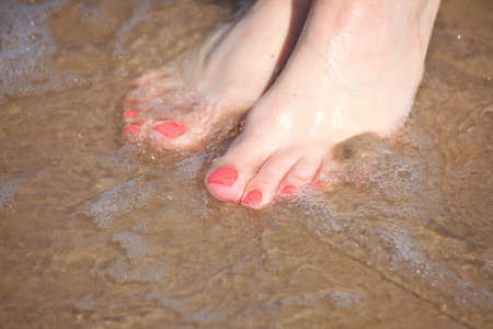 nice legs in water, nice pedicure red nail sand beach