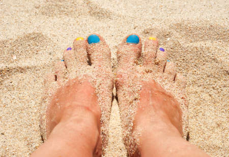 Woman feet with colorful nails in the sand