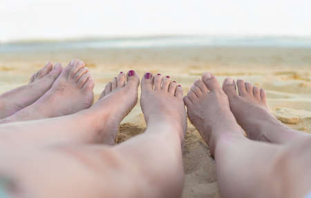 group of friends feet resting and relaxing on the beach with the ocean in the background. vacation and friendship concept.