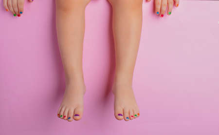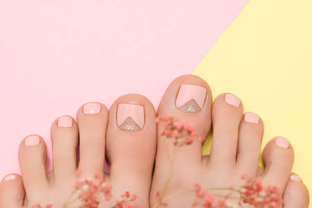 Feet with cream nail design. Pink nail polish pedicure on pink yellow background