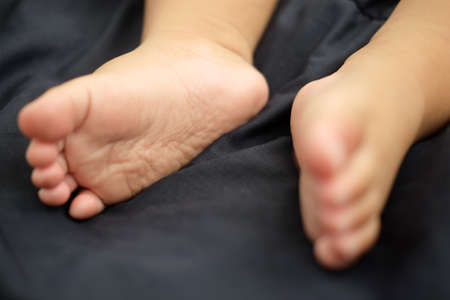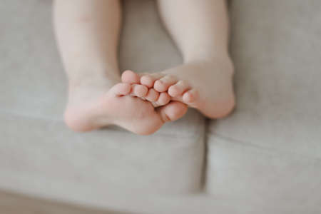 child bare little feet close-up indoors. child sitting barefoot.