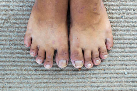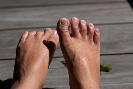 Women's second toes, middle toe, fourth toe crooked, In wooden background, Close up & Macro shot, Selective focus, Asian Body skin part, Healthcare concept