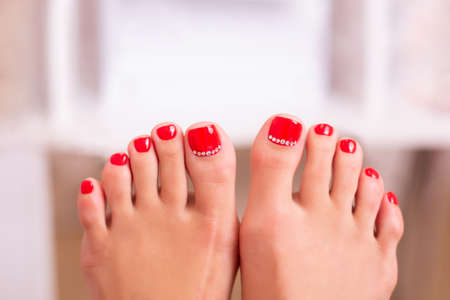 Close up view of beautiful female feet with delicate pedicure nails, red gel polish, on beauty salon background