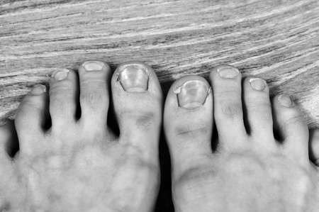 black and white photo broken and ingrown ugly toenails of a sloppy girl. overgrown nails and dry skin with calluses on the fingers with hair. medical pedicure