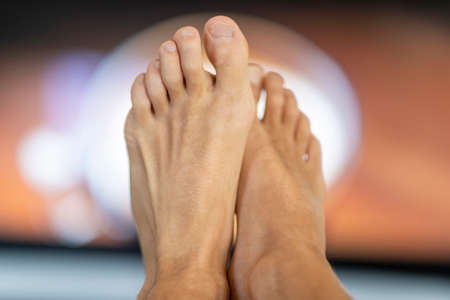man toes with long - Two feet sitting next to a laptop at night with neon vivid - Eastern European Latvia Riga.