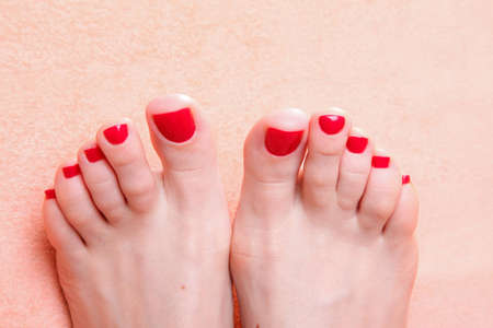 woman feet with red toenails on pink towel