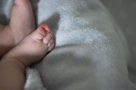 Baby feet on light blanket with christmas lights