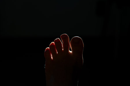 A low, frontal view of the toes of a foot backlit against a dark background, with the tips of the toes illuminated and in silhouette.