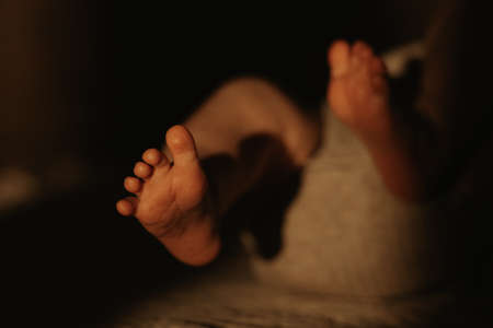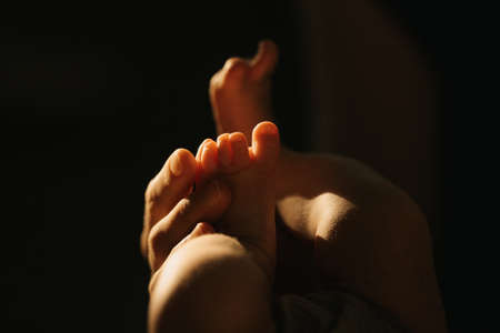 A close-up photo of the gentle hand of the mother who is massaging the foot of her newborn baby. The legs of the infant in the sunlight in the evening.