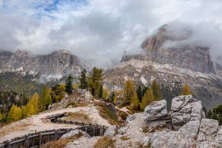 Spectacular hiking trail near Cinque Torri cliffs, Dolomites, Italy, Europe