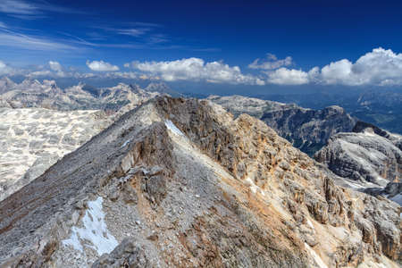 Northern ridge of Piz Boe, on background Sassongher mount and Odle-Puez group, Trentino, Italy