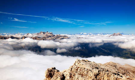 Lagazuoi Mountains above clouds around Averau and Pelmo Mountains, Belluno Province at Dolomites Italian Alps in Italy