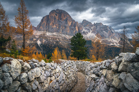 Beautiful autumn colors in Dolomites mountain, Tofana peak, Cinque Torri mountain in Italy, Europe