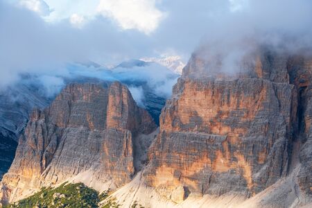 Epic close-up view of some mountain peaks somewhere in Dolomites, Italy. Arounded by clouds. High view