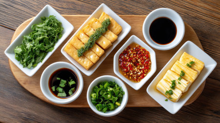 A visually appealing arrangement of fresh herbs, tofu, and various dipping sauces on a wooden board, perfect for a vibrant culinary experience or meal presentation.