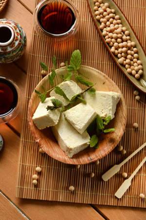 Healthy food ingredient, tofu on bamboo basket