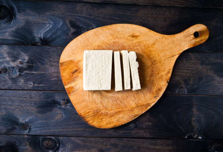 Slices of raw tofu on shabby cutting board. Top view