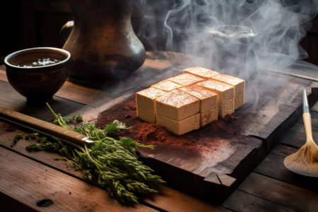 tofu on cedar plank, smoke billowing, grill tools nearby, created with generative ai