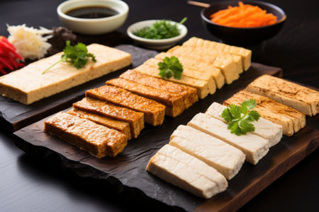 display of assorted tofu steaks on wooden platter