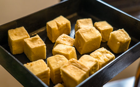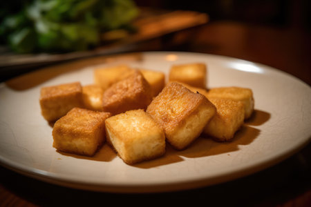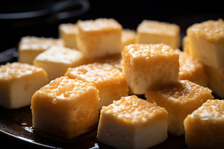 Stir Fried Tofu, Healthy Vegan Chinese Food, Diced Fry Tofu Cubes on Dark Background, Abstract Generative AI Illustration