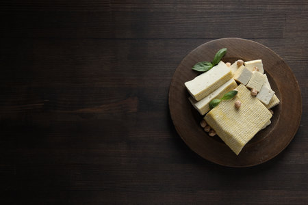 Sliced fresh tofu on black plate decoration with coriander leaf, Vegan Food ingredients in Asian food