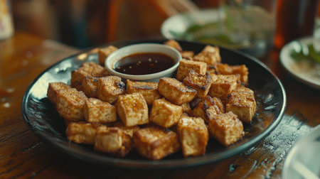 A plate of crispy fried tofu cubes, golden-brown and served with a sweet soy dipping sauce