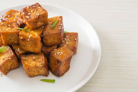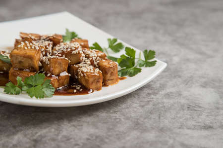 fried tofu with white sesame and teriyaki sauce - vegan and vegetarian food style