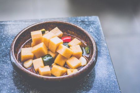 tofu marinated in a bowl. traditional chinese dish Food recipe background. close up.