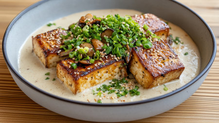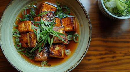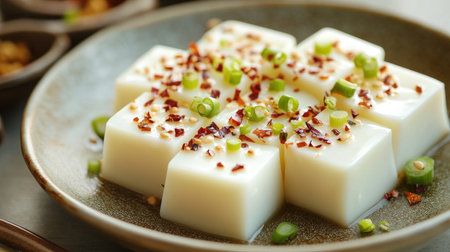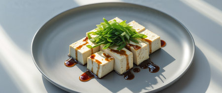 AI Generated. Fresh Tofu Dish with Green Onions and Soy Sauce Glaze Served on a Gray Plate in Natural Light