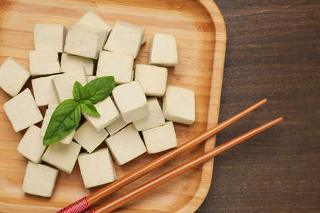 Delicious tofu with basil and chopsticks on wooden table, top view