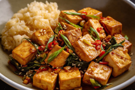 This vibrant Asian dish features cubes of tofu complemented by fresh vegetables and a spicy sauce, perfect for a nutritious and appetizing meal.