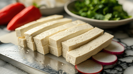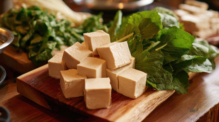 This image features freshly cut tofu cubes artfully arranged on a wooden board alongside vibrant green vegetables. Ideal for those who love cooking healthy meals and embracing plant-based diets. Perfect for culinary inspiration.