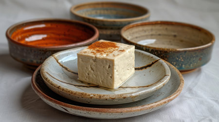 Tofu on Wabi-Sabi Plate - A single cube of tofu centered on a handmade ceramic plate, cracks in the glaze echoing its minimalist beauty. Soft shadows.
