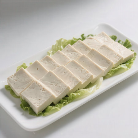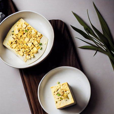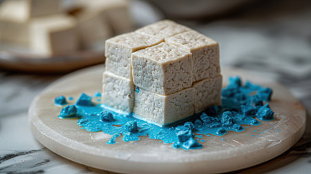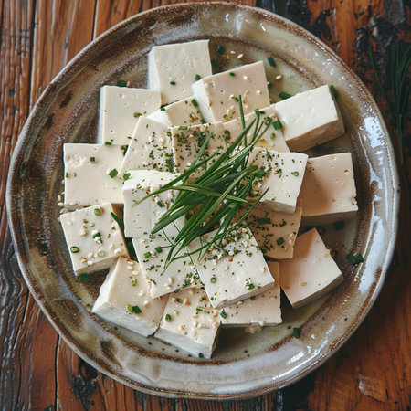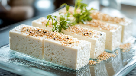 This image features freshly made tofu blocks topped with sesame seeds and herbs, elegantly arranged on a glass plate. Perfect for showcasing healthy, plant-based culinary delights.